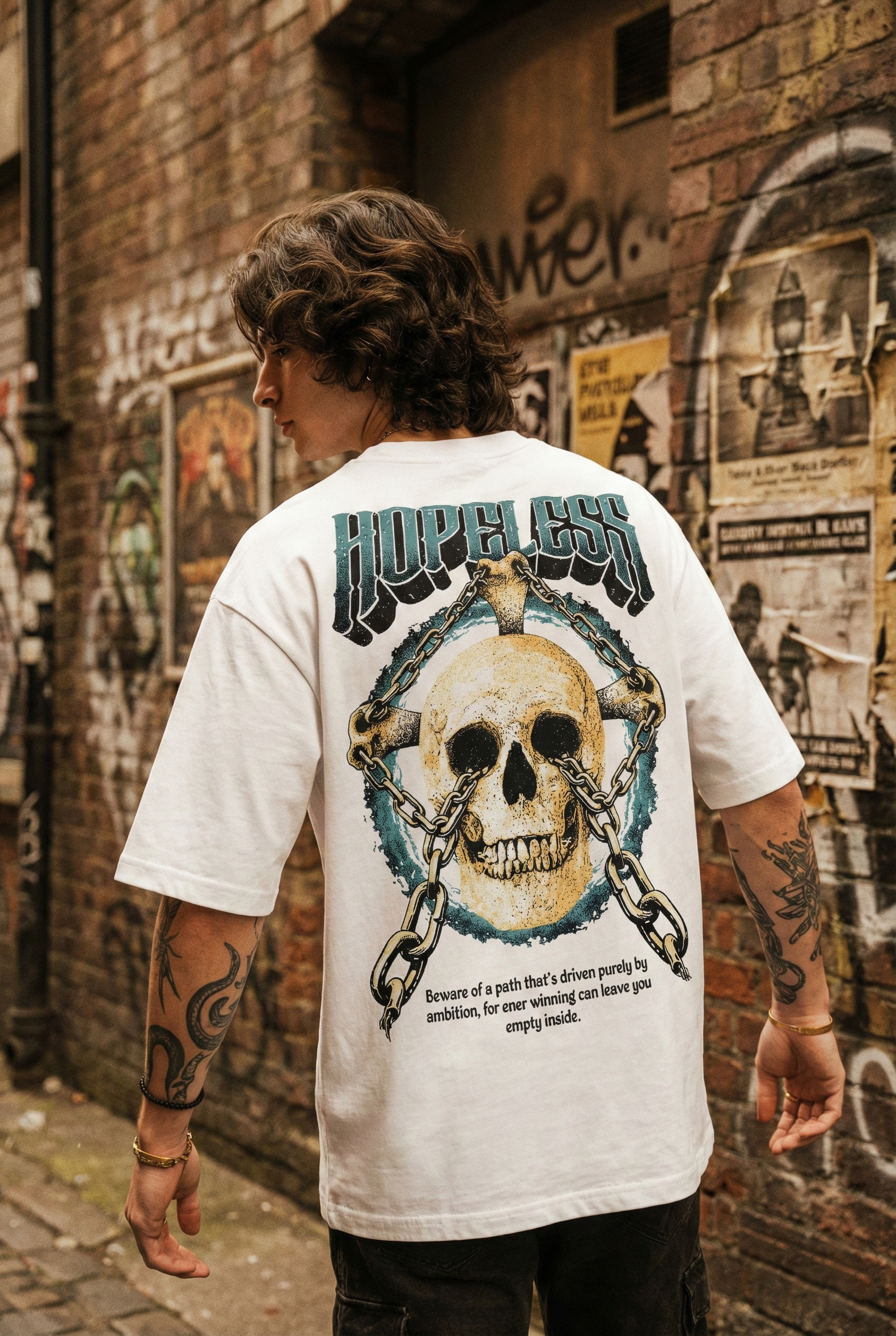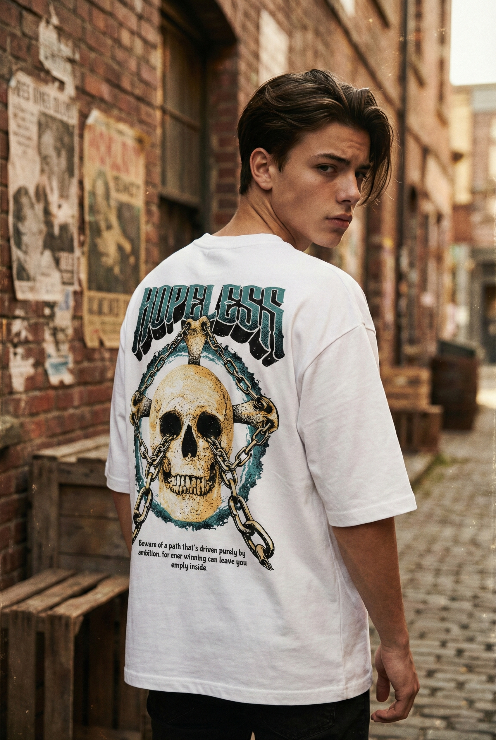 Dark Streetwear T Shirt Hopeless Skull Chain – W18 is a design rooted in darkness, reflection, and underground spirit. The shirt explores themes of hopelessness, inner emptiness, and ambition through skull imagery, heavy chains, and a powerful message, making it a strong statement piece for those who embrace dark streetwear culture with depth.