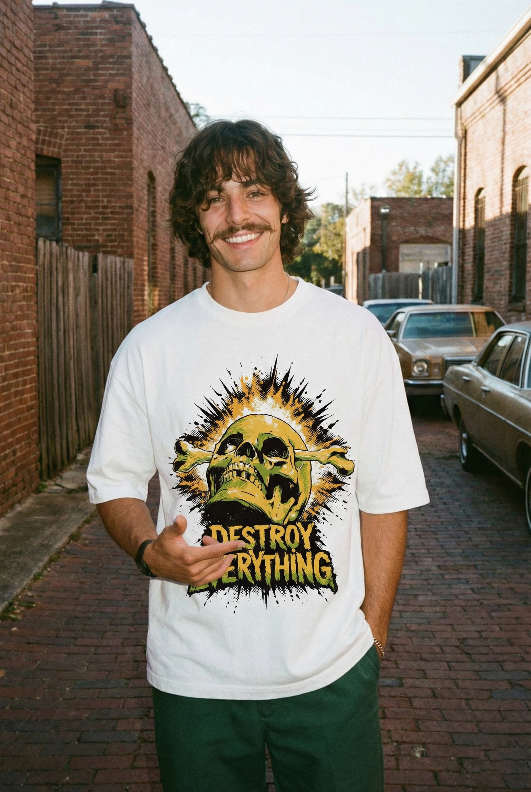 🔸 The DESTROY EVERYTHING slogan appears in a rough, distressed font inspired by punk and underground culture