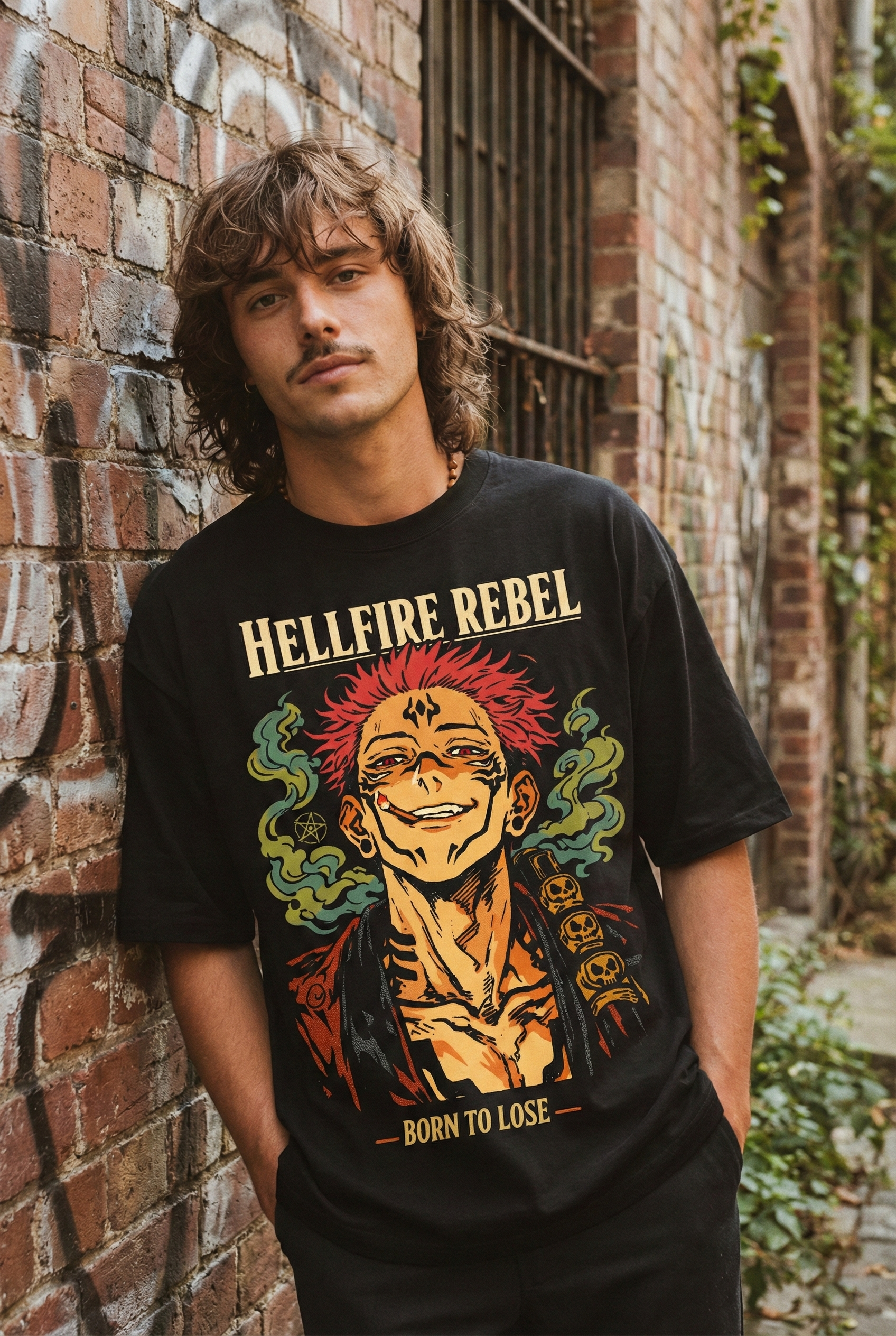 The Jujutsu Kaisen Sukuna Hellfire Rebel – SPB6 is part of the SPECIAL EDITION collection, embodying the dark, destructive aura of the King of Curses himself. This design captures Sukuna’s arrogant grin, piercing gaze, and overwhelming presence — made for those who live for anime culture and bold streetwear energy.