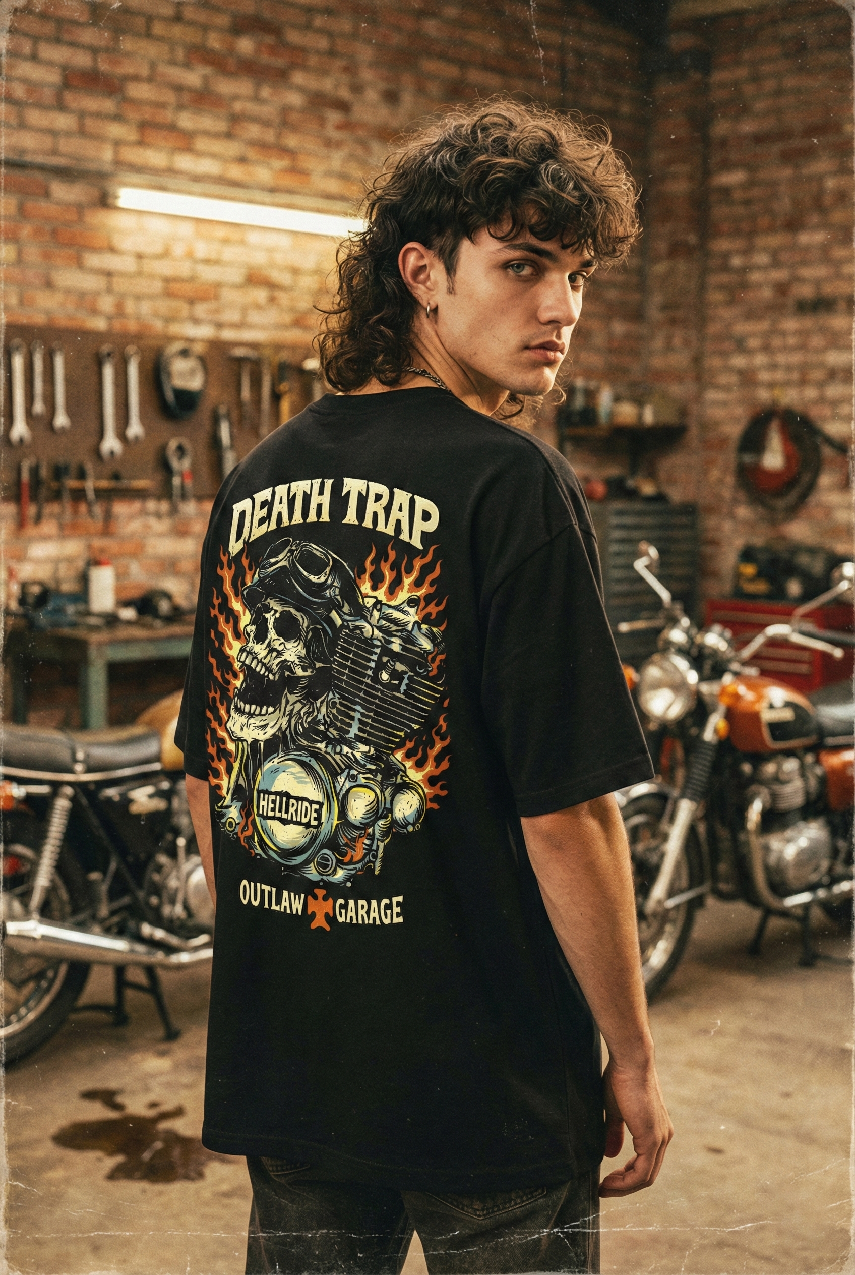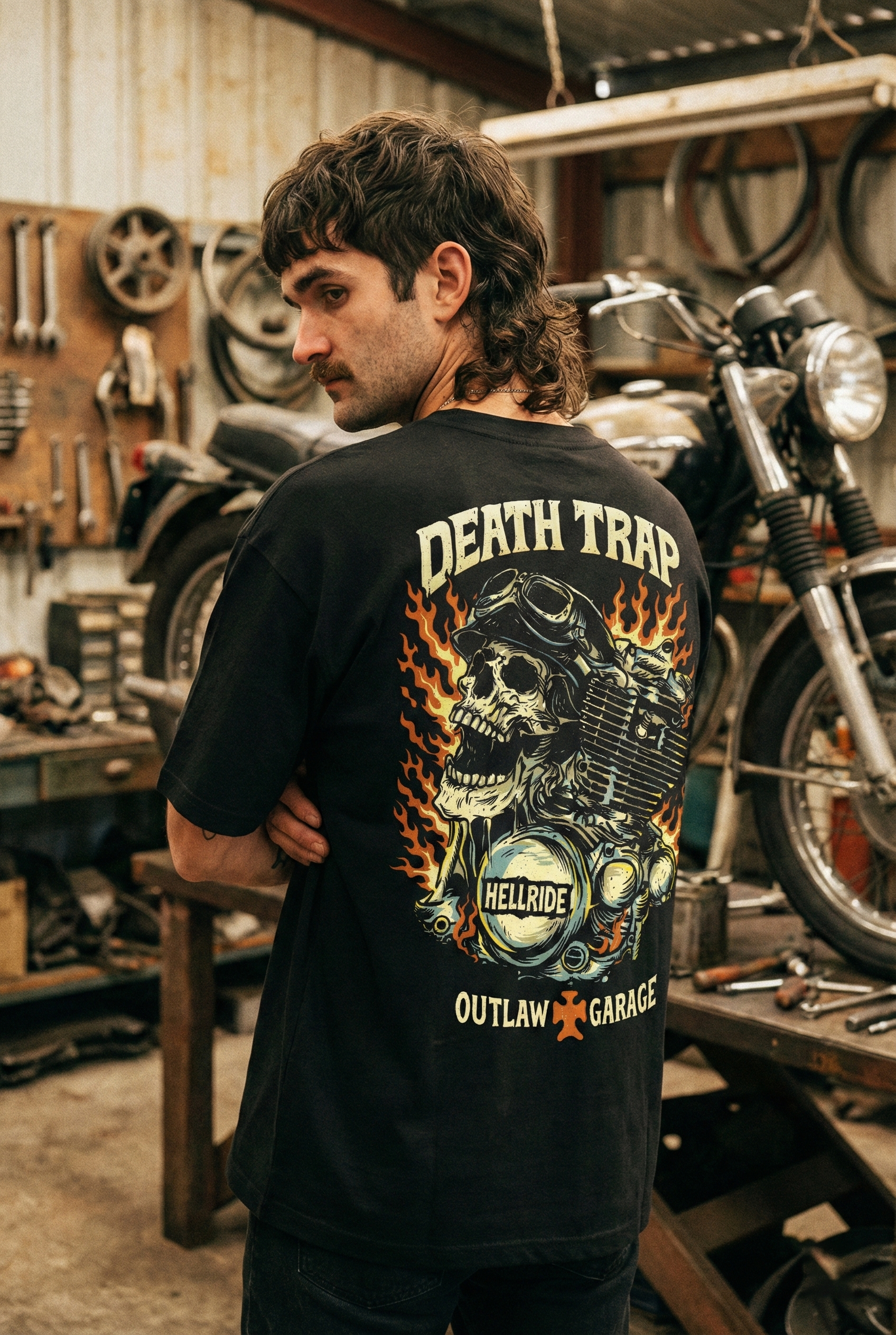 🔸 HELLRIDE and OUTLAW GARAGE details emphasize rebellion and lawless spirit
