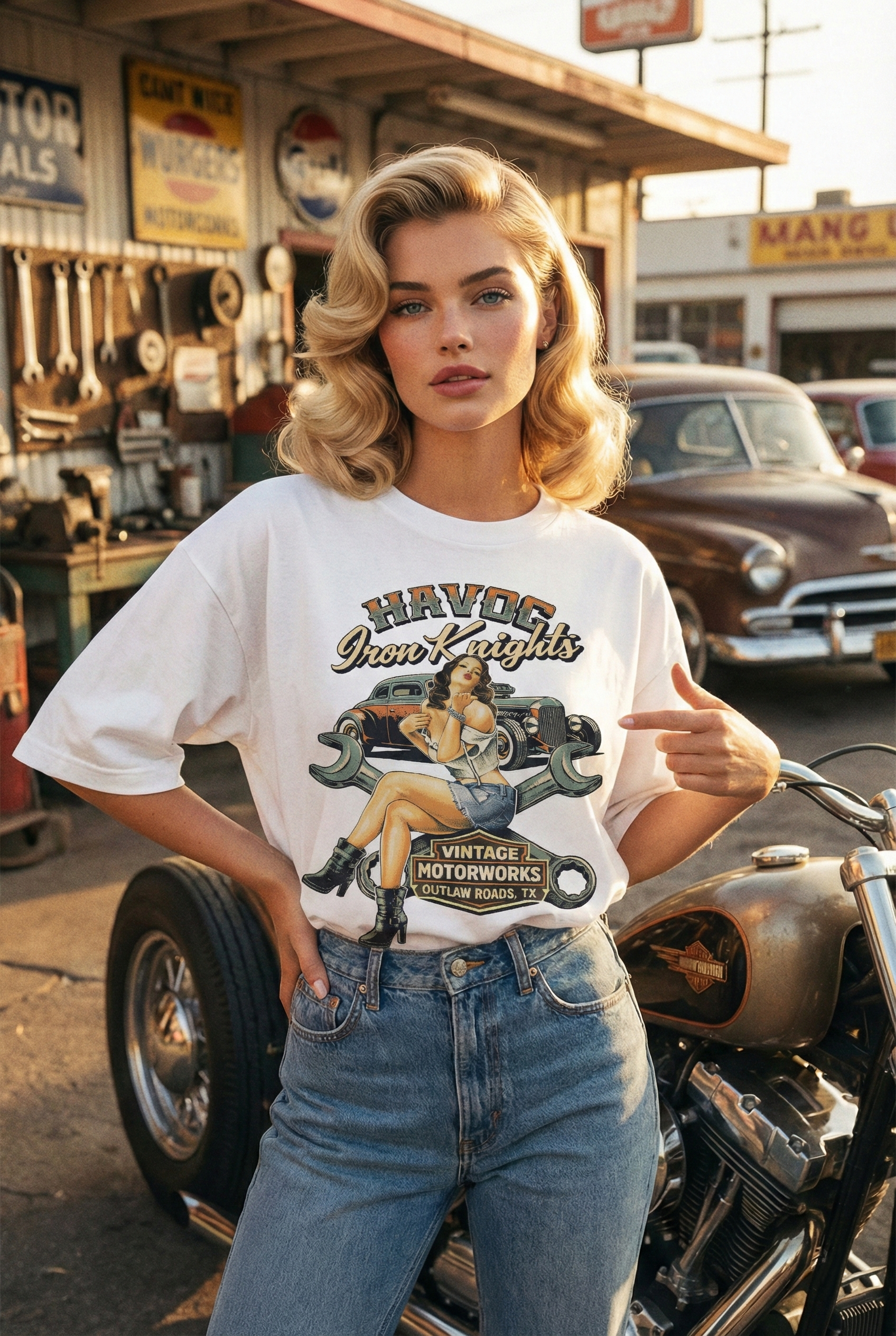 Áo thun streetwear vintage Havoc Iron Knights – W24 là thiết kế mang tinh thần motor cổ điển, garage culture và pin-up vintage, pha trộn giữa nét gợi cảm hoang dã và chất cơ khí mạnh mẽ. Tổng thể graphic gợi cảm giác bụi bặm, tự do và phóng khoáng, đúng chất streetwear vintage dành cho những ai mê xe, mê tốc độ và mê cái đẹp cổ điển.